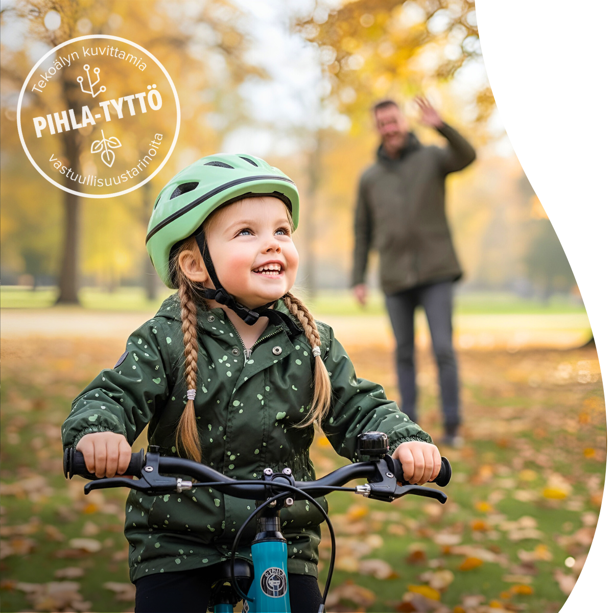Pihla-tyttöä hermostutti pyöräily ja pyörä tuntui hyvin suurelta. Isä antoi Pihla-tytölle pyöräilijän tärkeimmän suojavarusteen, josta Pihla-tyttö oivalsi jälleen uutta. Lue tarinasta, mitä Pihla-tyttö oivalsi.
