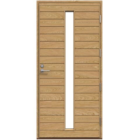Suunnittele omasiVaakasuoraan kulkevalla leveällä paneloinnilla varustettu puinen ulko-ovi, jossa on korkea ja kapea lasiaukko. Puuovi ECO-malliston ovet ovat valittavissa erilaisin kuultosävyin käsiteltyinä, jolloin elävä puupinta jää ilmeikkäästi näkyviin. Pihla Puuovi ECO-malliston ovet valmistetaan valikoidusta puuaineksesta, käsityönä perinteisillä puusepän menetelmillä Suomessa.